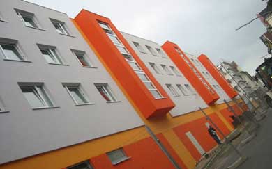 Was sich die Architekten dieses neuen Studentenwohnheim in Bielefeld gedacht haben ist mir ein Rätsel. Ist das so etwas wie Retro-Stil im Baugewerbe? Sind die Türgriffe dann in Pril-Blumen-Form? Grell! möchte ich meinen. Wie wacht man da morgens auf? Ich glaube ich mache mich mit einem Sonnenbrillenstand an der Ecke von diesem Komplex selbstständig …