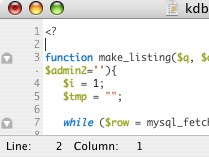 Nach dem Start bin ich erstmal ernüchtert. Das Ding sieht auf den ersten Blick nicht anders als TextEdit aus. Also flugs mal eine .php-Datei geöffnet. Uuuuh. Das Highlightning funktioniert, ist für meinen Geschmack aber ziemlich augenkrebsfördern. Auf dem ersten Blick sieht man dann auch sofort, dass man Funktionen zusammenklappen kann – was ich auch in jEdit ziemlich praktisch finde. Zeilen lassen sich auch durchnummerieren. Ok! Irgendeine Form von Semi-Automatic-Completion ist auch integriert.  Tippt man an geeigneter Stelle ein fun und hämmert dann auf die [ESC]-Taste so wird aus dem fun ein function. Das gefällt. Interessant wird dies, wenn man eine Variable eingeben will, an deren Namen man sich nicht mehr so ganz genau erinnert – aus $d wird dann $daytime oder nach dem nächsten Klick auf die [ESC]-Taste die nächste Möglichkeit wie in meinem Beispiel $dog_eat_cat (good dog!). Ziemlich praktisch ist auch das Feature, dass Klammern automatisch im Pärchen gesetzt werden. Öffnet man also eine [ so erscheint automatisch eine ], der Cursor bleibt aber zur Texteingabe dazwischen stehen (Wer wie ich die Klammern meist eh zusammen eingibt kann damit aber auch leben, da das Programm dies erkennt, also trotzdem nur ein Paar ausgibt). Gleiches gilt übrigens für die Anführungszeichen.