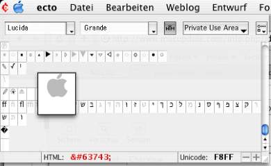 Für Web-Dingser besonders freundlich – zu jedem Zeichen wird auch die entsprechende Entität angezeigt. Ich bin ja immer noch ganz beeindruckt, dass man (zumindest für andere Mac-Benutzer) mit  einen Apfel auf den Bildschirm zaubern kann (). Schön fände ich ja auch, wenn Windows-Nutzer wenigstens ⎋ als ⎋ sehen würden. Aber egal und zurück zur Software. Das Tool finde ich also eigentlich wirklich nett, aber US$ 15 sind mir dann doch zu viel (allerdings sei hier kurz angemerkt, dass ein Konkurenzprodukt namens PopChar X sogar unglaubliche US$ 29 kostet ), da greife ich dann wohl doch auf die Zeichentabelle zurück.