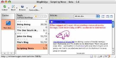 BlogBridge! ist ein javabasierender und somit xplattformfähiger Feedreader (Es gibt aber für jede Plattform eine eigene Version, so dass die OS X Version auch brav die Menüzeile nutzt, wie ein normales Programm). Noch einer? Jo. Aber ich finde den eigentlich ganz gelungen. Das Programmfenster ist dreigeteilt. In der linken Spalte werden die sogenannten Guides – eine zusammengefügte Gruppe von Feeds – angezeigt. Jedem Guide kann ein Icon zugeordnet werden. In der mittleren Spalte in dann die Namen der Feeds, die einem Guide angehören dargestellt.