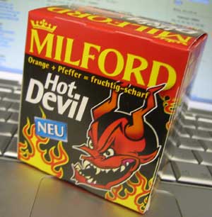 Ich bin geschockt, begeistert, verwirrt. Lassen wir das eigentliche Produkt (Teebeutel mit Pfeffer-Orange-Geschmack) mal aussen vor. Was hat sich die Marketing-Abteilung bei der Verpackungsgestaltung gedacht? Versucht man mit dem Design die Jugend generell anzusprechen oder hofft man auf einen einschlagenden Erfolg in der Tatoo- und Hotrod-Szene?