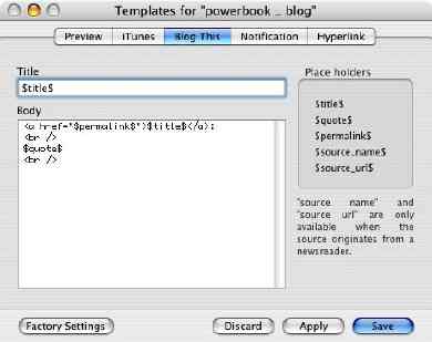 Einen kleinen Leckerbissen, der von mir bislang noch unbemerkt geblieben war, kann ich auch noch liefern. Als erster deutlicher Hinweis auf das spätere Zusammenspiel mit NetNewsWire2 gibt es einen Dialog, in dem man bestimmen kann, wie man den entsprechenden Link, der via des NNW-„Blog This“ in ecto gesendet wird, übernommen werden soll. So sieht man auch schon mal, welche Variablen da übergeben werden.