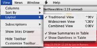 Über das Menü View – Layout hat man die Möglichkeit, (in dem linken oberen Fenster) bei der Auflistung der Überschriften sich noch zwei weitere Informationszeilen (einmal die Zusammenfassung, einmal eine Zeile mit Zeitangaben des Beitrags) zu dem Beitrag ausgeben zu lassen. Das wirkt dann schon ein bisschen unübersichtlich.
