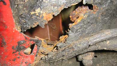 Nach einer Begutachtung des Fahrzeugs konnte ich folgende eklatante Mängel feststellen: a) Motorträger mit starkem Rostbefall vorne links. b) vorne Rechts 2×4 cm große Durchrostung an der Karossiere an der Stelle, wo der Motorträger verschraubt ist (siehe Bild) c) Reflektoren des rechten Scheinwerfers blind (nicht ganz so blind wie der Tüv-Prüfer der dieses Fahrzeug abgenommen hat) d) Durchrostung am rechten Innenschweller e) Durchrostungen am hinteren, linken Federbeindom. Ganz zu schweigen von den Bildern der A-Säulen, die ich noch gemacht habe, in den der Rost wunderschön blühte.