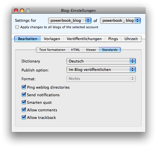 Global kann man das in den Einstellungen bearbeiten ( Menü – ecto – Einstellungen – Weblog – Reiter Bearbeiten ). Wann und warum das jetzt so bei mir stand, weiss ich nicht. Aber immerhin ist es jetzt geändert und mein bescheidenes Weblog ist jetzt wieder offen für Eure Trackbacks …
